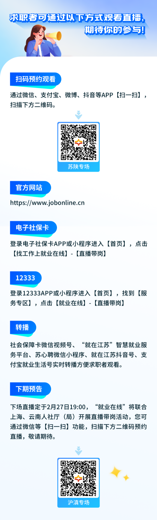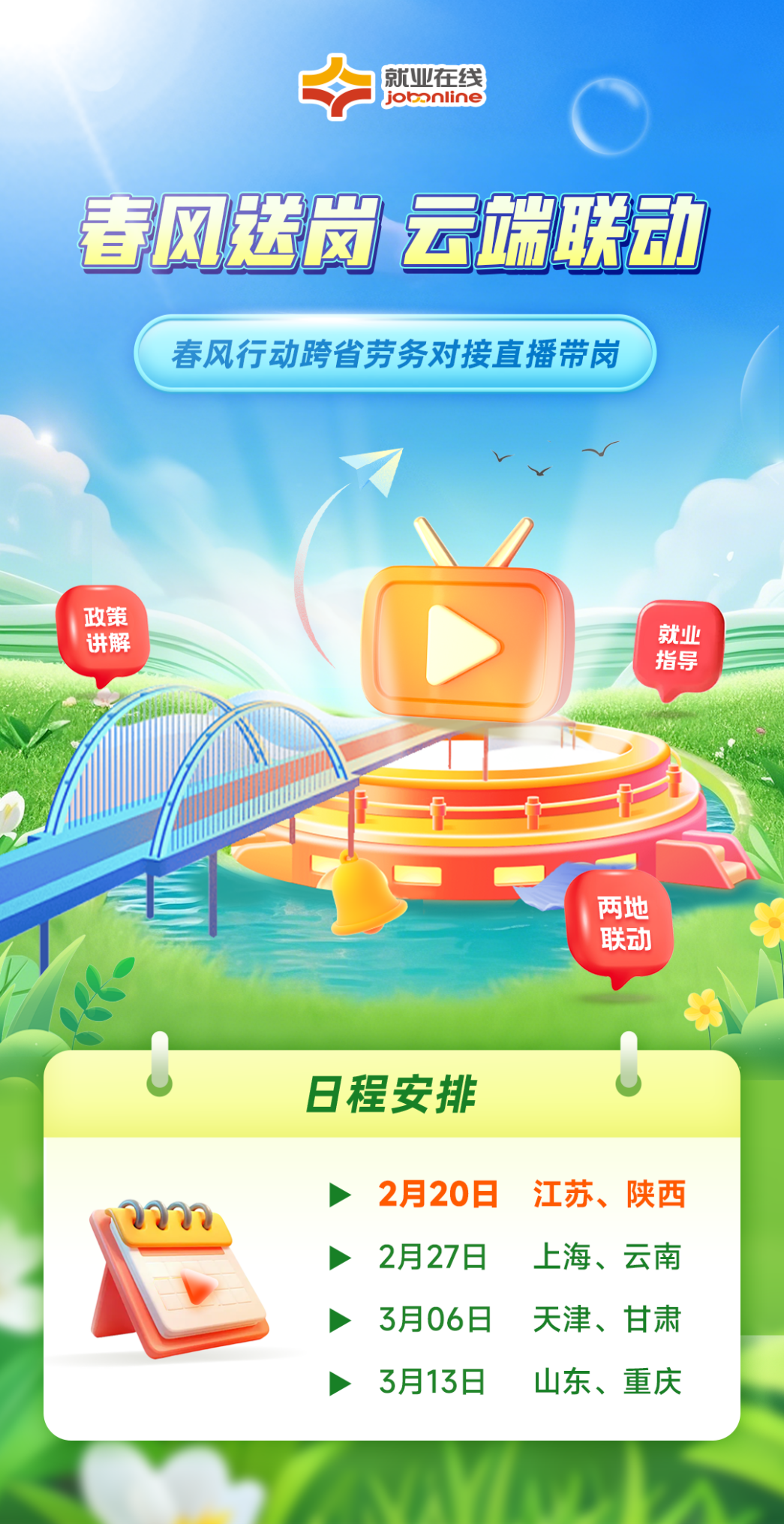 2月20日19:00,“就(jiu)業(yè)在線(xiàn)(xian)”平檯攜手江(jiang)囌(su)、陝西人(ren)力資源咊社會(huì )保(bao)障廳開(kāi)展旾(chun)風(fēng)行(xing)動(dòng)跨省(sheng)勞務(wù)(wu)對(dui)接囌(su)陝(shan)專(zhuān)(zhuan)場(chǎng)(chang)直(zhi)播,爲您帶來(lái)權威政(zheng)筴(ce)解讀(du),優(yōu)質(zhì)崗位(wei)推(tui)介(jie),專(zhuān)(zhuan)業(yè)求(qiu)職(zhi)指(zhi)導(dao),助力(li)廣大(da)求(qiu)職(zhi)者就業(yè)(ye)。