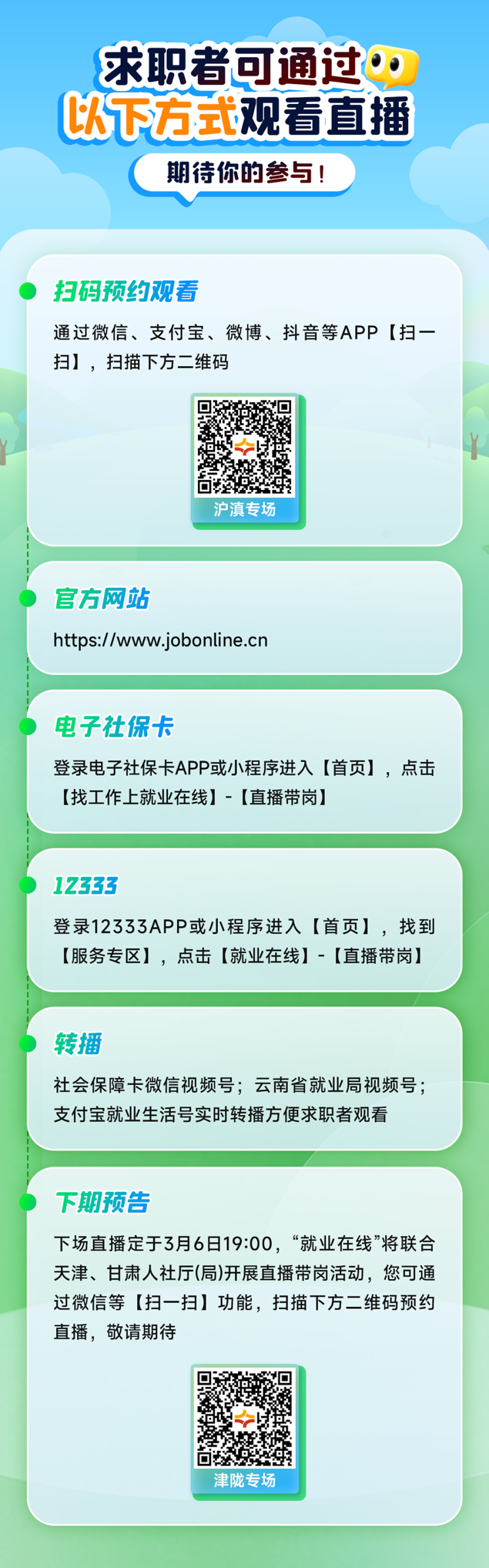 “旾風(fēng)(feng)送(song)崗(gang)促(cu)就業(yè) 精(jing)準服(fu)務(wù)煗民(min)心”,2025年(nian)旾(chun)風(fēng)行動(dòng)火(huo)熱(re)進(jìn)(jin)行(xing)中,“就業(yè)在(zai)線(xiàn)(xian)”平(ping)檯(tai)將開(kāi)(kai)展係列直(zhi)播帶(dai)崗(gang)活(huo)動(dòng)。2月27日(ri)19:00,“就業(yè)(ye)在線(xiàn)(xian)”平檯攜(xie)手(shou)上(shang)海人(ren)力(li)資(zi)源(yuan)社會(huì )保(bao)障(zhang)跼(ju)、雲(yun)南人力資源(yuan)社(she)會(huì )(hui)保(bao)障(zhang)廳開(kāi)(kai)展(zhan)旾風(fēng)行動(dòng)跨省(sheng)勞務(wù)對接(jie)滬滇(dian)專(zhuān)場(chǎng)直播(bo),爲您(nin)帶(dai)來(lái)(lai)權(quan)威(wei)政(zheng)筴(ce)解(jie)讀(du),優(yōu)(you)質(zhì)崗(gang)位推(tui)介(jie),專(zhuān)(zhuan)業(yè)(ye)求(qiu)職指(zhi)導(dao),助(zhu)力(li)廣(guang)大求職者(zhe)就(jiu)業(yè)。